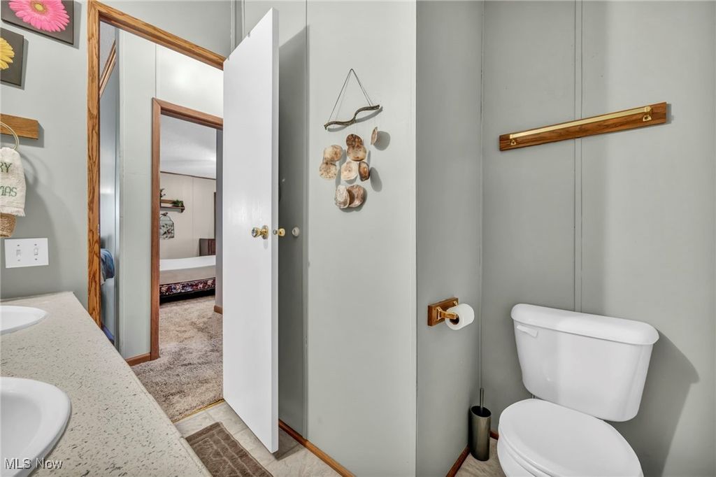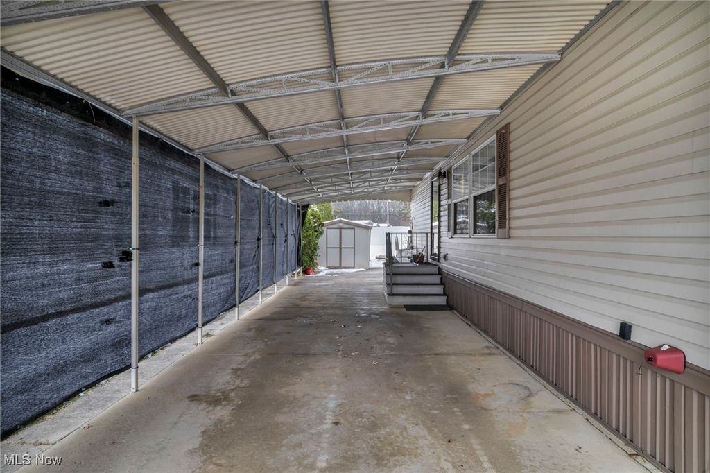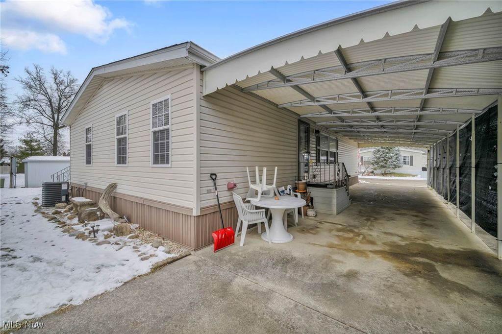 Welcome to this spacious and beautifully maintained triple-wide Palm Harbor home located in the desirable Twin Oaks II community of Olmsted Township. Offering an impressive 1,787 sq ft of one-floor living, this 3-bed, 2-bath residence delivers comfort, convenience, and thoughtful upgrades throughout. The open floorplan creates an inviting flow, beginning with a generous living room featuring natural woodwork, built-in shelving, and an electric fireplace that adds warmth and charm. Adjacent is a dedicated dining area and a large kitchen equipped with brand-new stainless steel appliances, ample cabinet storage, and generous counter space. A convenient laundry room with washer and dryer included adds everyday practicality. The spacious primary suite features a walk-in closet and a large en-suite bathroom complete with double vanities, soaking tub, and separate shower. Two additional well-sized bedrooms and a second full bath with double vanities offer flexibility for guests, family, or office use. Recent updates include a roof approximately 5 years old, HVAC system also around 5 years old, and newer windows enhancing energy efficiency and comfort. Outside, enjoy a covered carport with parking for up to three vehicles, a storage shed, and a level landscaped lot that backs to an open yard space. Vinyl fencing adds privacy, while community features such as curbs, sidewalks, and streetlights contribute to a welcoming suburban environment. Located within the Olmsted Falls School District, this home sits on leased land with a monthly lot rent of $700. Public water and sewer, central air, and low-maintenance vinyl siding complete the package. With a rare triple-wide layout, modern updates, and a move-in-ready interior, this property offers exceptional value and comfortable living in a peaceful neighborhood close to shopping, highways, parks, and local amenities. A wonderful opportunity for anyone seeking space, affordability, and convenience.
